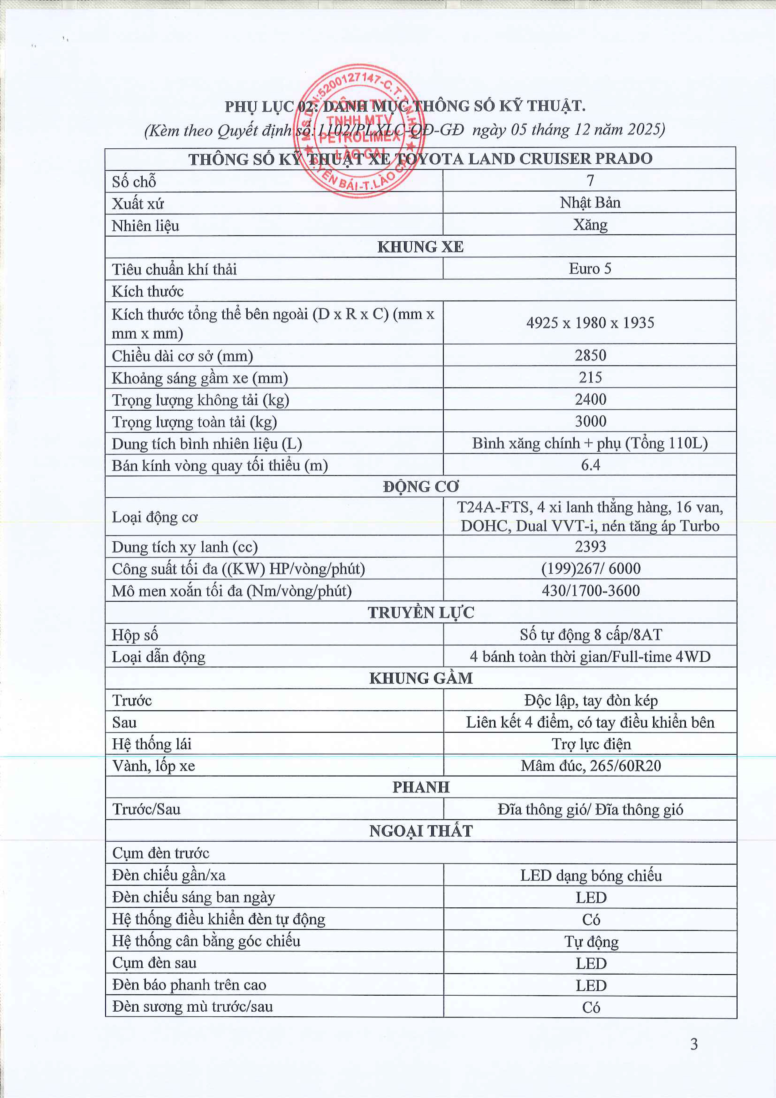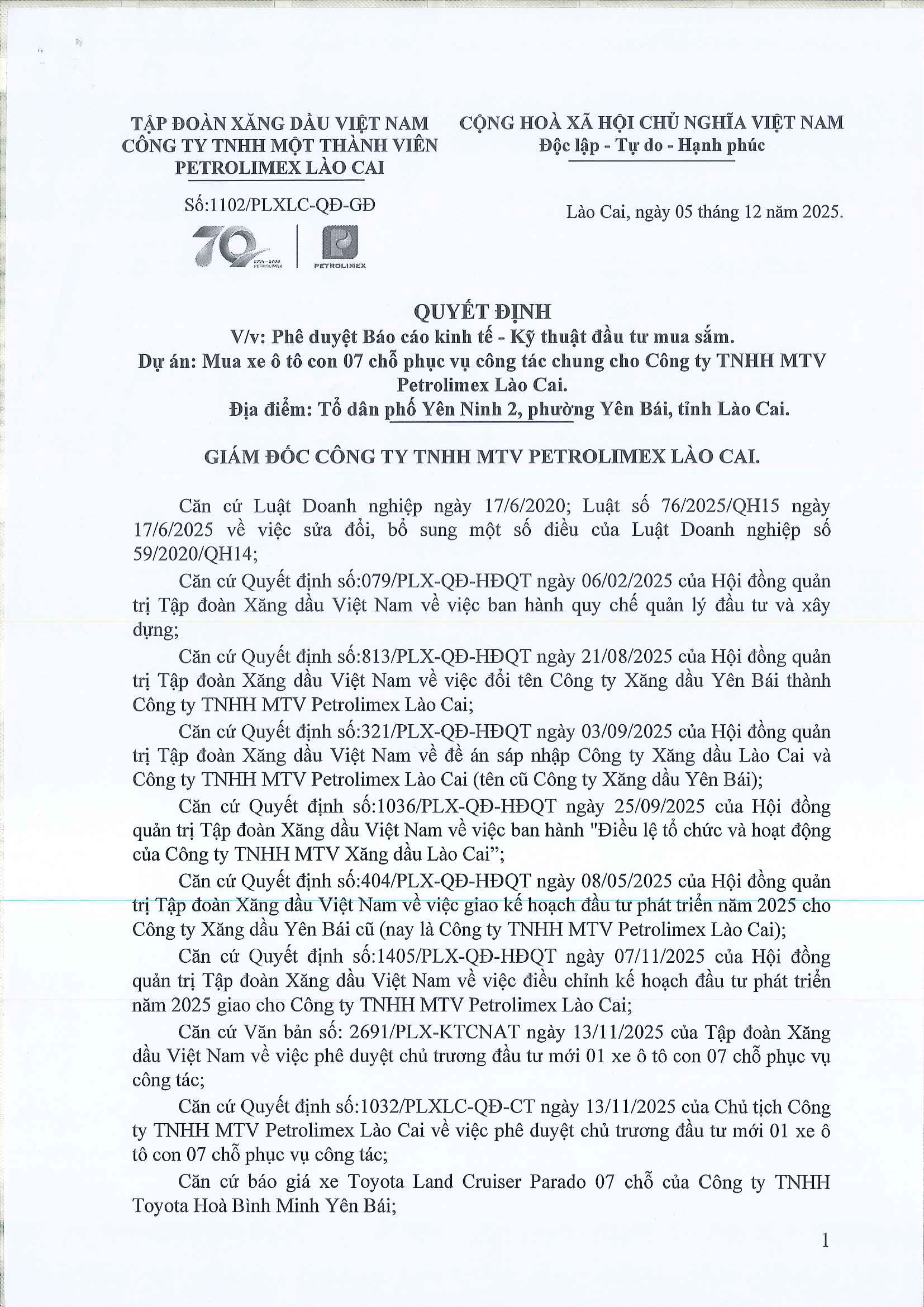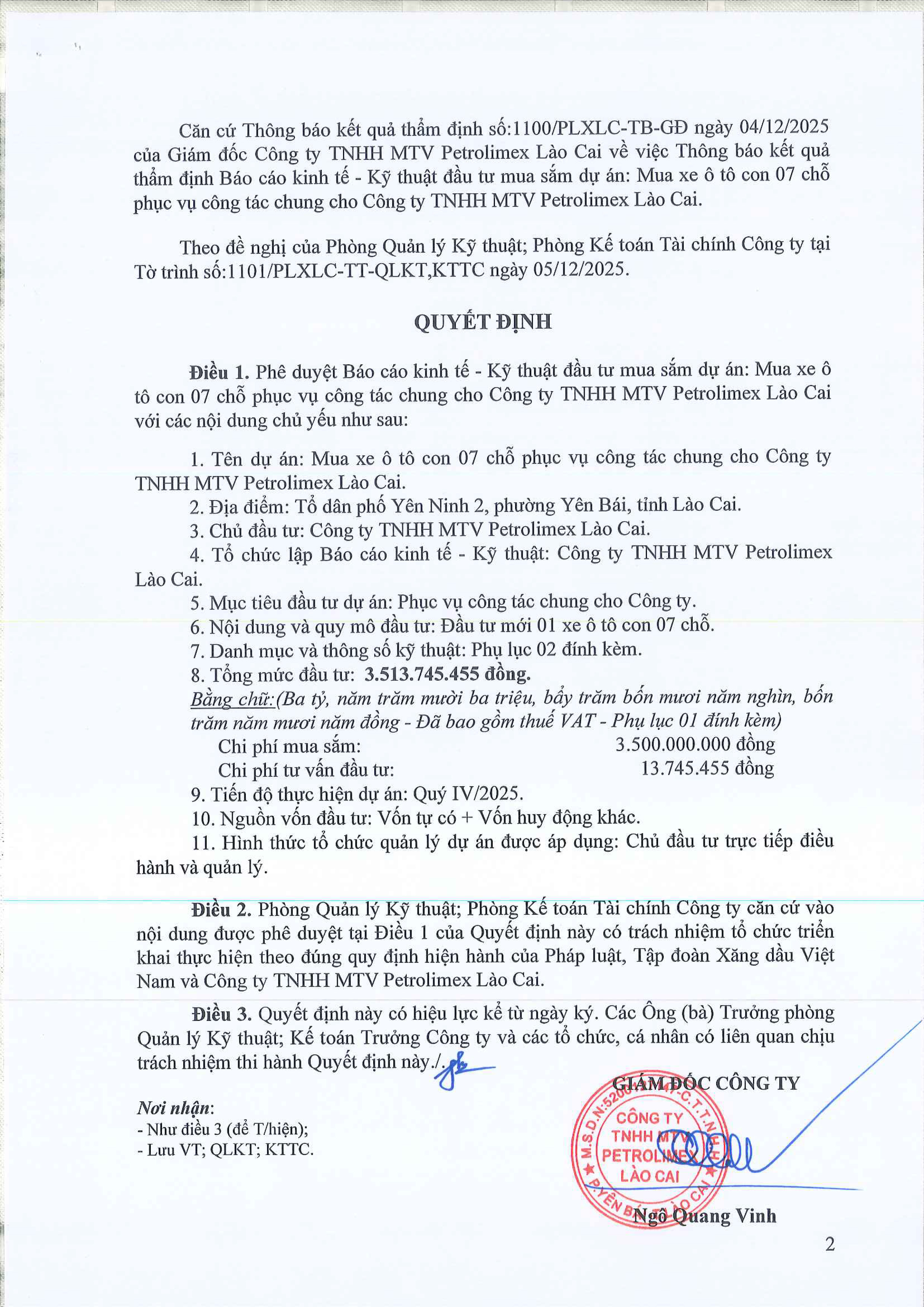 Quyết định phê duyệt báo cáo kinh tế - kỹ thuật đầu tư mua sắm. Dự án: mua xe ô tô con 7 chỗ phục vụ công tác chung cho Công ty